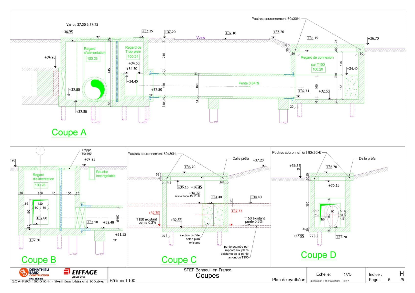 L’ouvrage d’arrivée des eaux de la station se compose de trois parties : la partie existante, à réhabiliter, le Bypass, pour diriger les eaux vers la station de Bonneuil ou vers celle d’Achère et l’ouvrage de connexion à l’ovoïde existant.