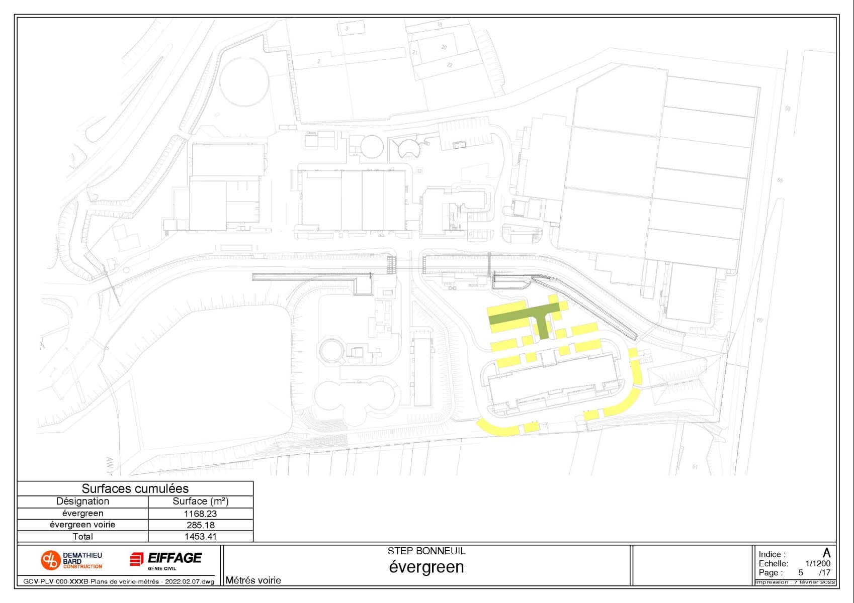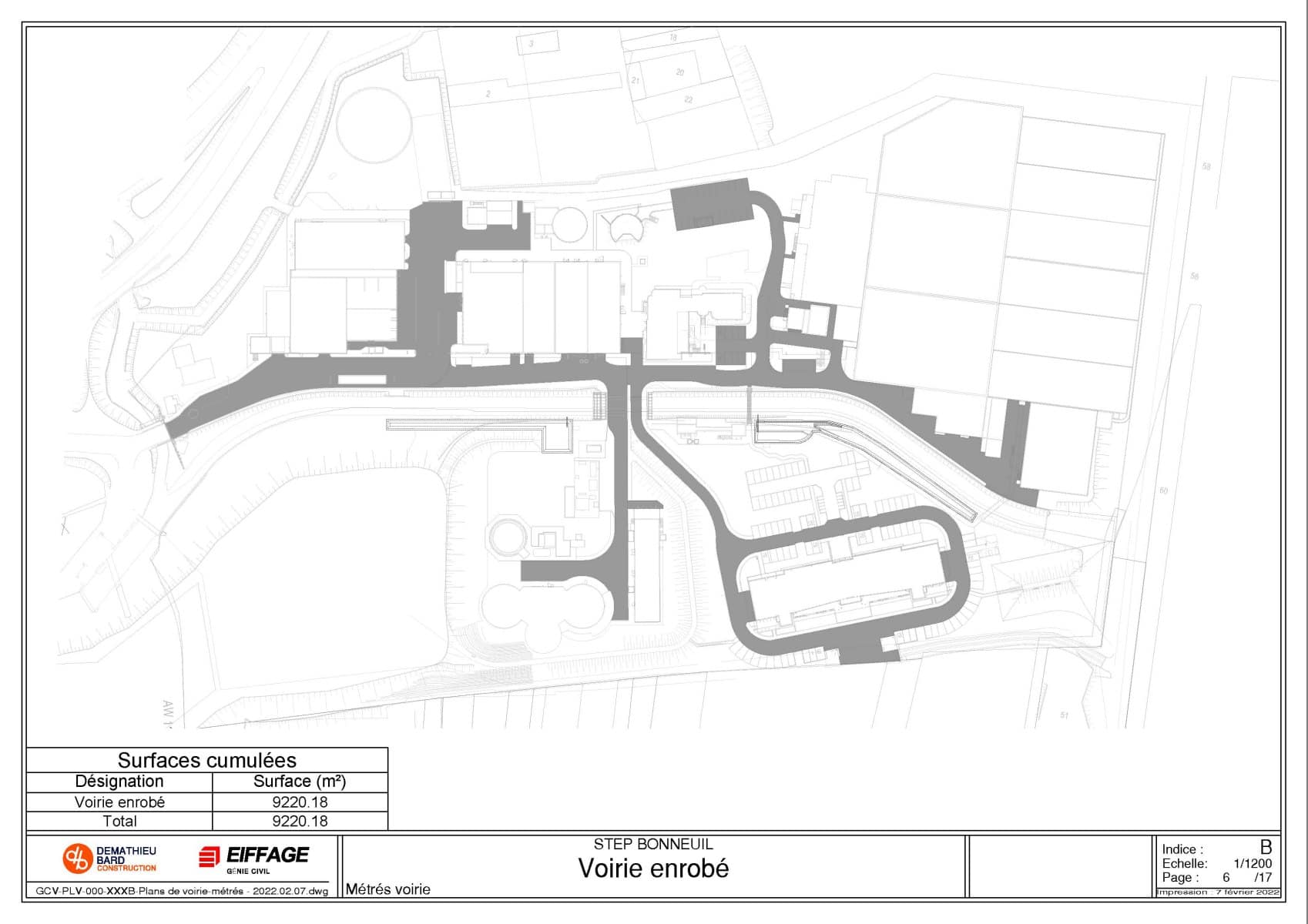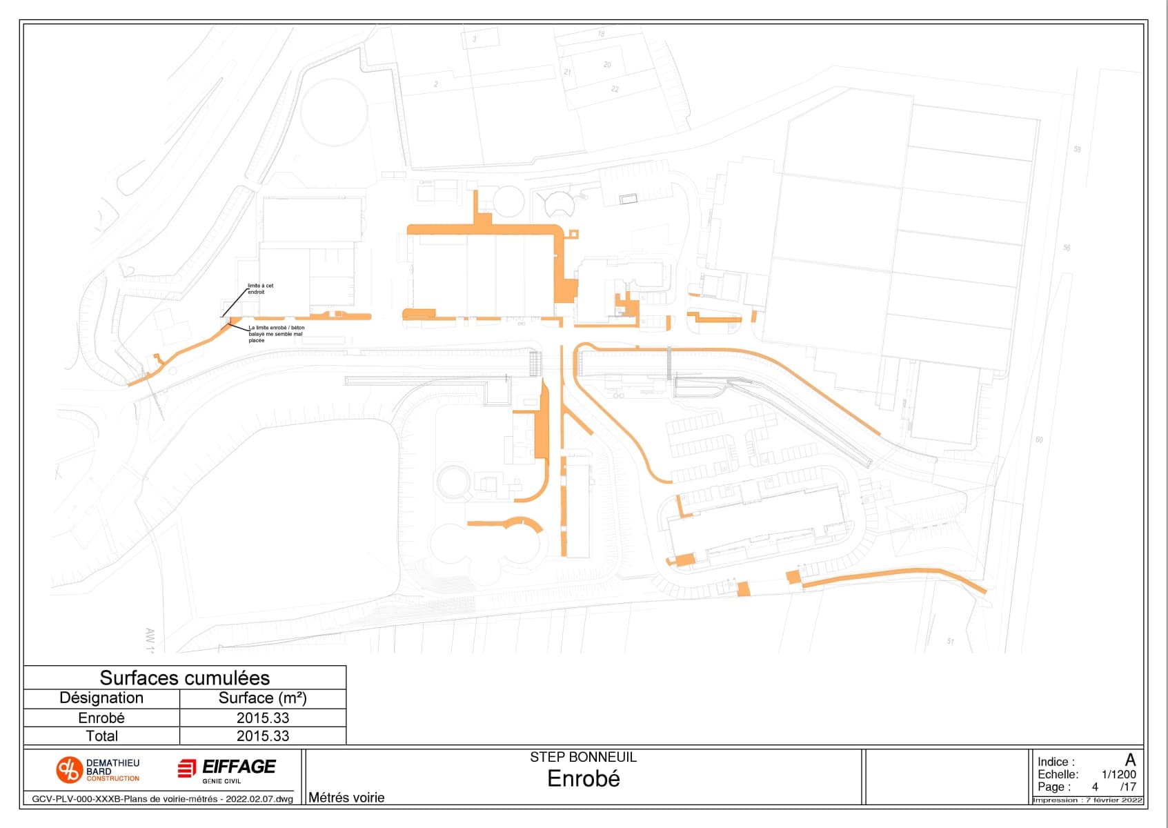 Grâce aux différents logiciels StormACAD Métré, il a été possible de calculer rapidement les différentes surfaces (enrobé, Evergreen, béton balayé etc), les linéaires de bordure et le nombre d’avaloirs.