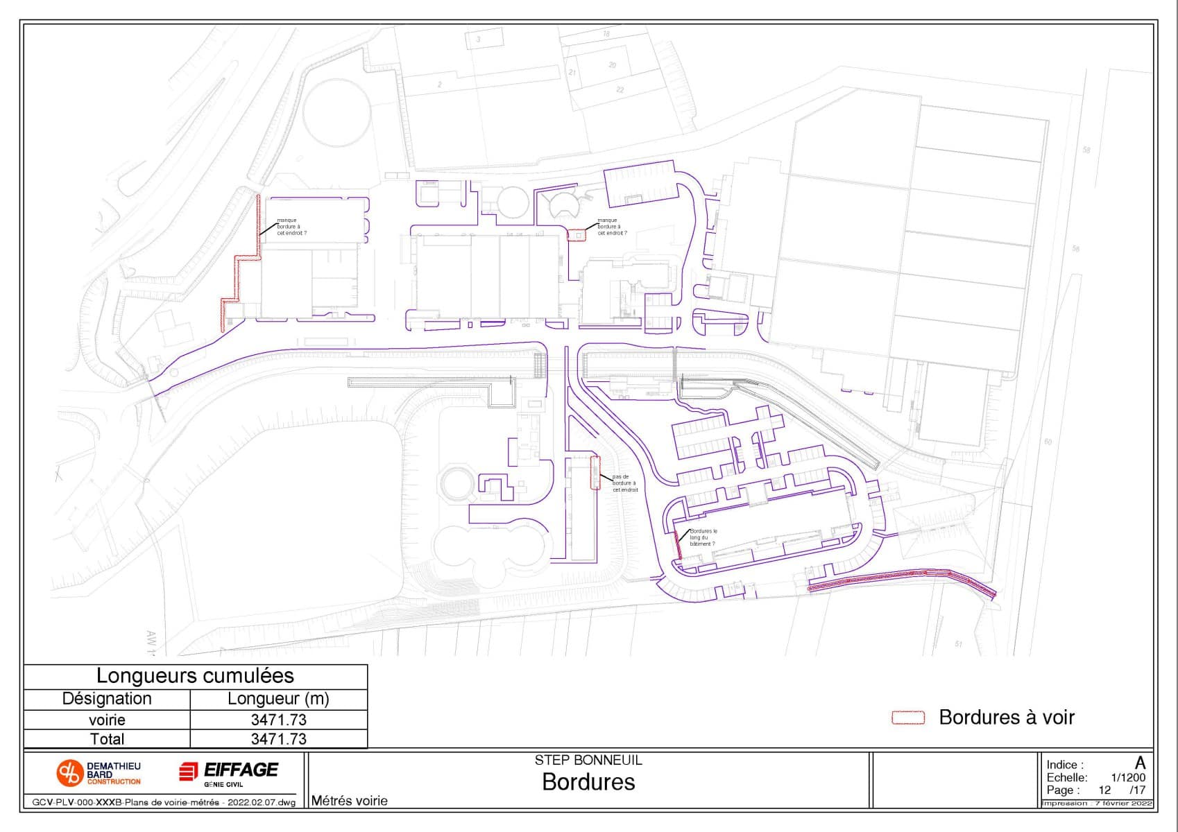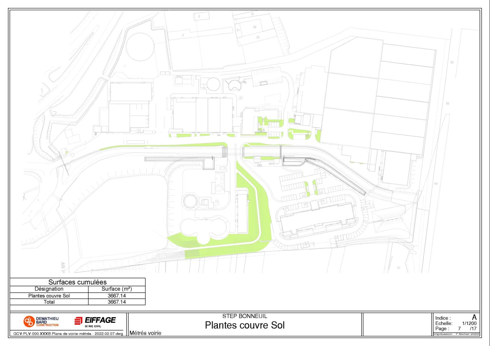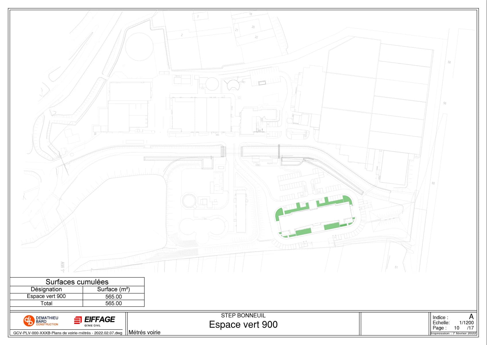 Grâce aux différents logiciels StormACAD Métré, il a été possible de calculer rapidement les différentes surfaces (enrobé, Evergreen, béton balayé etc), les linéaires de bordure et le nombre d’avaloirs.