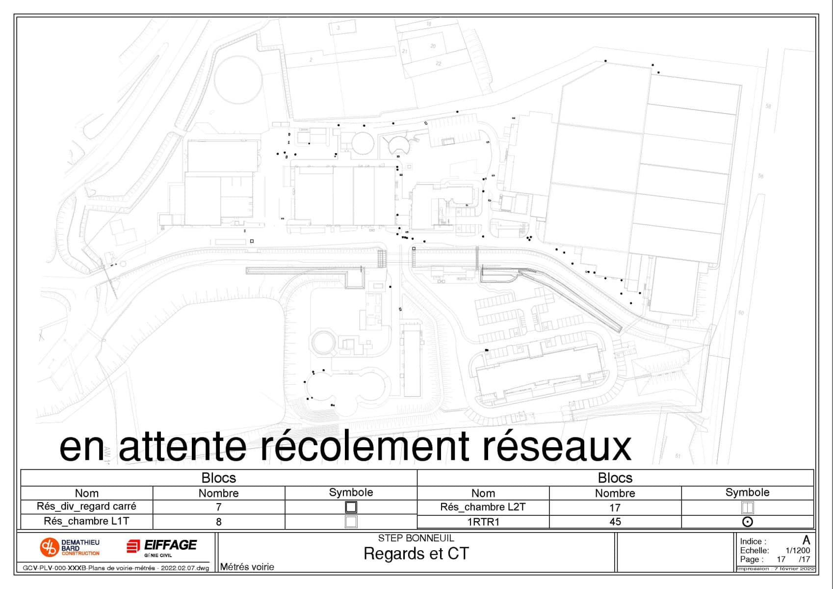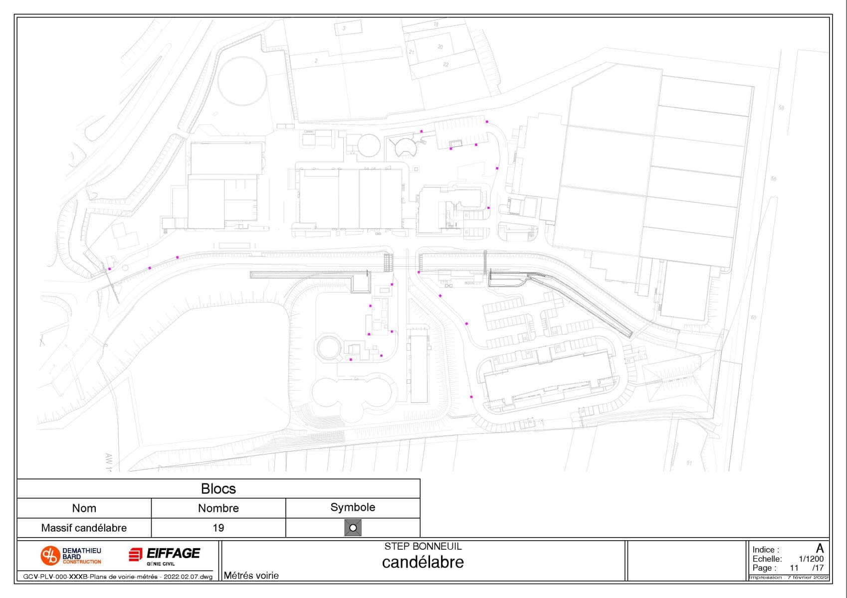 Il a été nécessaire de réaliser un plan des pieux à l’extérieur des bâtiments pour différents ouvrages, notamment les canalisations en béton armé, la difficulté étant d’éviter les réseaux existant tout en respectant la distance maximum entre pieux.
